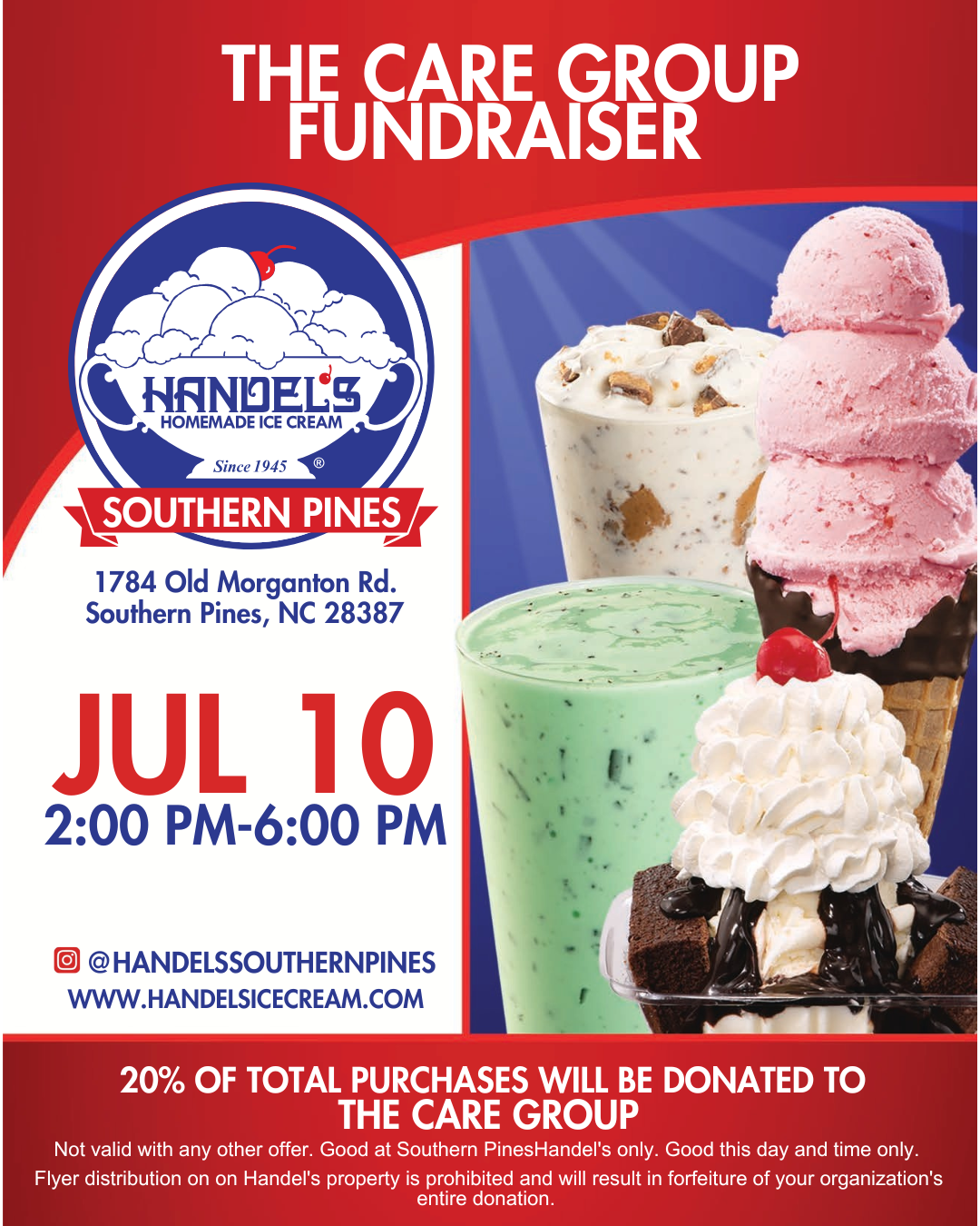 Join us for a yummy fundraising event at Handel's Homemade Ice Cream in Southern Pines on Thursday, July 10th from 2pm-6pm.